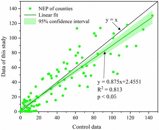 The NEP data obtained in the study were validated for 2001, 2011, and 2020. Taking 2001, 2010, and 2021 as validation, our results are significantly correlated with the NEP dataset calculated by Han and Liu (R2 = 0.813, p < 0.05).