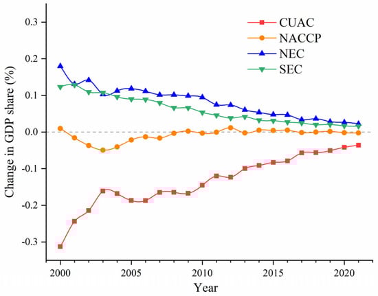 Establishing a lateral compensation mechanism between unequal regions is an important way to promote sustainable development [], but case studies of inter-regional carbon compensation in China are inadequate. We quantified the annual carbon deficit and carbon compensation costs of Chongqing since 2000, compared the differences among counties, and enriched the understanding of regional carbon compensation. Furthermore, to test the coordination function of carbon compensation on coordinating regional development [], we analyzed the change in the share of each county in Chongqing’s GDP after including carbon compensation costs. As shown in Figure 13, the change in the GDP share of the CUAC region with a higher economic level after compensation was always less than 0, which means that the region continued to pay compensation. In contrast, the changes in the GDP shares of the SEC and NEC regions with ecological resource advantages after compensation were always greater than 0, which means that they continued to receive compensation. In brief, carbon compensation can play an effective coordinating role in regional development.