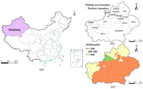 (a) Schematic diagram of Xinjiang’s location; (b) overview and territorial divisions; and (c) precipitation distribution map.