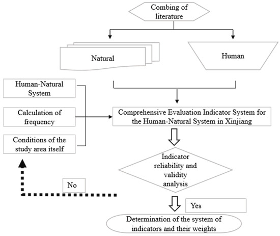 Before constructing a comprehensive evaluation index system for the human–natural system in Xinjiang, the first task is to clarify the evaluation goal. The setting of this goal needs to be closely centered on the harmonious development of human and nature, and secondly through the literature analysis method, drawing on the research experience of scholars on the coupling of regional human–natural systems and the establishment of a regional comprehensive indicator system [21,29]. Combined with the natural attributes of arid zones, the indicators are selected through expert consulting method and the frequency analysis method, ensuring that the selected indicators can comprehensively and accurately reflect the actual development in various dimensions, following the principles of science, system, operation, and representativeness. The selection of indicators is based on the principles of scientificity, systematicity, operability, and representativeness to ensure that the selected indicators can comprehensively and accurately reflect the actual situation of each dimension. Due to the characteristics of the human–land system data, such as the variety of types, formats, and standards, human–land system big data in Xinjiang generally have the problems of a low degree of data integration, difficulty in matching the scales of natural and socio-economic data, and difficulty in meeting the demand for data quality. The indicator system is amended by deleting irrational indicators and adding or replacing some of the indicators, and then the perfected indicator system is fed back to the relevant experts and scholars. Then, the improved indicator system was fed back to relevant experts and scholars, and, after the validity and reliability analysis and repeated discussions and modifications, a more perfect indicator system of the human–land system in Xinjiang was finally determined, as shown in Figure 4. A comprehensive evaluation index system was constructed from five dimensions: ecological environment, urban and rural livability, cultural characteristics, civil harmony, and green development, and 40 elements of the indicator system were derived (Table 2). After standardizing the indicator data by extreme deviation, the weights of the indicators were determined by the information quotient method and the expert scoring method.