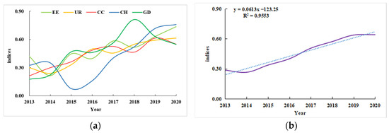 (a) Xinjiang five subsystem development index from 2013 to 2020; (b) Xinjiang comprehensive development indexfrom 2013 to 2020.