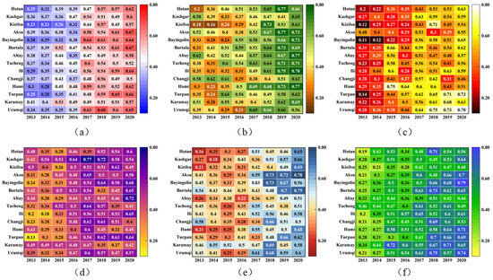 Index of Various Regions in Xinjiang from 2013 to 2020. (a) CD; (b) EE; (c) UR; (d) CC; (e) CH; (f) GD.