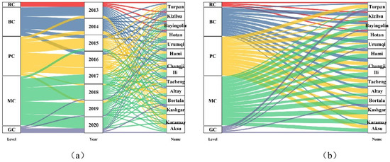 During the 2013–2020 period, the changes in the type of coupled human–natural system coordination in Xinjiang’s prefectures are extremely obvious, while the differences are also significant. RC is mainly concentrated in 2013, BC is mainly concentrated in 2013–2016, PC is distributed between 2013–2019, MC is mainly in 2017–2020, and GC mainly appears in 2018, 2019, and 2020. The Xinjiang human–natural system coupling coordination grades are mainly concentrated in the three grades of barely coupled coordination, primary coupled coordination, and intermediate coupled coordination in each state. The coupling coordination level in Xinjiang has obvious changes in space, showing a trend of gradual increase from south to north. The level of coupling coordination in Xinjiang shows some fluctuation, but generally shows an upward trend, and the coupling coordination grade generally shifts from low to high.