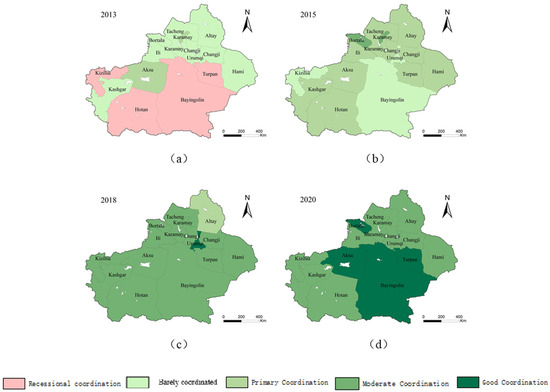 Spatial evolution of coupling coordination types in Xinjiang human–natural system. (a) 2013; (b) 2015; (c) 2018; (d) 2020.