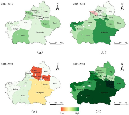 The human–land system in Xinjiang has exhibited an upward trend in coupling and coordination over four time nodes (2013, 2015, 2018, 2020), as shown in Figure 9. Notably, from 2013 to 2015 (Figure 9a), the coupling coordination increased. Hotan, Bortala, and Turpan had significantly faster growth rates, with values of 0.14, 0.13, and 0.13, respectively. In contrast, Urumqi and Aksu had the slowest growth rate, at 0.01. It is worth noting that, from 2015 to 2018 (Figure 9b), the coupling coordination degree of the human–land system in Xinjiang exhibited a remarkable upward trend, with a growth rate that surpassed that of 2013 to 2015. Kizilsu, Urumqi, and Bayingonlin experienced faster growth, with values of 0.24, 0.24, and 0.21 respectively, while Bortala showed a decline, with a decline rate of 0.01. From 2018 to 2020 (Figure 9c), the coupling coordination both increased and decreased. Bortala and Akesu showed a significant increase, at rates of 0.11 and 0.1, respectively, while Karamay, Changji, Tacheng, and Urumqi decreased by 0.06, 0.02, 0.02, and 0.01, respectively. From 2013 to 2020, Figure 8d demonstrates a clear and consistent upward trend in the coupling coordination degree of the human–land system in Xinjiang. It is worth noting that Turpan, Bayingonlin, and Hotan have shown particularly impressive growth rates of 0.33, 0.32, and 0.31, respectively.