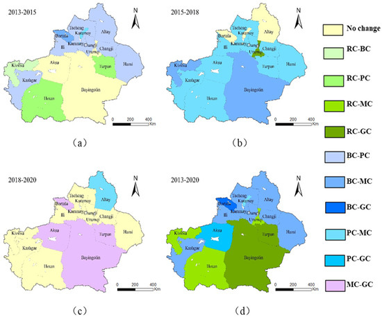 Figure 10 demonstrates a clear spatial increase in the coupling coordination level of Xinjiang’s human–land system. The level remained stable from 2013 to 2015 (Figure 10a), with primary coupling coordination increasing and barely coordinated coupling decreasing. Hami, Changji, Ili, Tacheng, Altay, Bortala, and Kashgar confidently progressed from BC to PC. Figure 10b clearly shows that, from 2015 to 2018, the transformation of coupling coordination level was mainly from primary to intermediate. Turpan, Hami, Changji, Ili, Tacheng, Kashgar, and Hotan have successfully transitioned from primary coupling coordination to intermediate coupling coordination. Additionally, Kizilsu, Kashgar, Hotan, and Turpan have made the successful transition from BC to intermediate coupling coordination. From 2018 to 2020, the level remained unchanged in Urumqi, Karamay, Hami, Changji, Ili, Tacheng, Kizilsu, Kashgar, and Hotan, as shown in Figure 10c. Figure 10d shows a clear increase in the level of coupling coordination in several prefectures between 2013 and 2020. The shift has been from forced coupling coordination to intermediate coupling coordination, which is a positive development. Notably, Urumqi, Hami, Changji, Ili, Tacheng, Altay, and Kashgar have all experienced this improvement. Karamay, Turpan, Bayingonlin, Bortala, Aksu, Kizilsu, and Hotan have all successfully transitioned to higher levels of development.