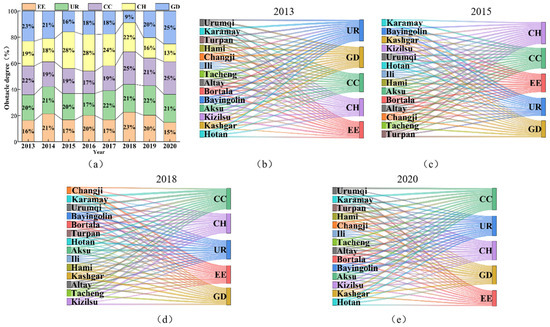 Analysis of obstacle factors in various subsystems from 2013 to 2020. (a) Change of subsystem obstacle degree from 2013 to 2020; (b) change of obstacle degree in various regions of Xinjiang in 2013; (c) change of obstacle degree in various regions of Xinjiang in 2015; (d) change of obstacle degree in various regions of Xinjiang in 2018; (e) change of obstacle degree in various regions of Xinjiang in 2020.