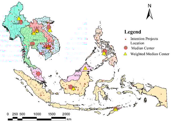 It can be seen from the calculation formulas of the median center and the weighted mean center that the most significant difference between the two is that the weighted mean center distinguishes the importance of different point data in the process of obtaining and using a specific attribute of the data concentration point as the weight to calculate the center position of the final data set. This paper used the median center based on the intention projects and the weighted mean center based on the area of the intention projects to reflect the spatial characteristics of LSLA projects in Southeast Asia. According to the coordinate data of LSLA projects, the spatial distribution of LSLA projects in Southeast Asia can be obtained using the preceding calculation formula and ArcGIS mapping tools (Figure 1).