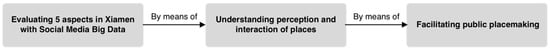 However, utilizing SMBD to understand public space perception and interaction is complex. First, the SMBD are often “loose”, “noisy”, and “scattered” due to the user-generated and self-motivated content [14]. This differs from typical surveys, which often have focused sample groups and ask targeted questions. Therefore, SMBD does not necessarily equate to high-quality data that can directly contribute to the design process. Furthermore, while using social media to aid learning perception and interaction in public spaces holds tremendous potential, there is currently a lack of examples demonstrating how to effectively integrate the various dimensions of SMBD with accessing attributes of placemaking. Much of the existing methodology only focuses on a single area of public spaces. For instance, SMBD can facilitate sentiment analysis to help designers understand people’s sentiments or opinions toward entities such as topics, places, and events [15]. Social media and street-level imagery can help designers understand urban functions [16]. Social media has the potential to empower designers’ understanding of urban vibrancy, leisure activities, exercise, and various other aspects [17,18,19]. However, there is limited research that provides an all-around framework for demonstrating a concrete picture of accessing attributes, social media data, and analysis methods. Designers often need to combine various datasets and analysis techniques independently, making it challenging to understand the space holistically. As the potential of social media data for placemaking grows, there is a need to develop integrated frameworks to support designers in their placemaking process.