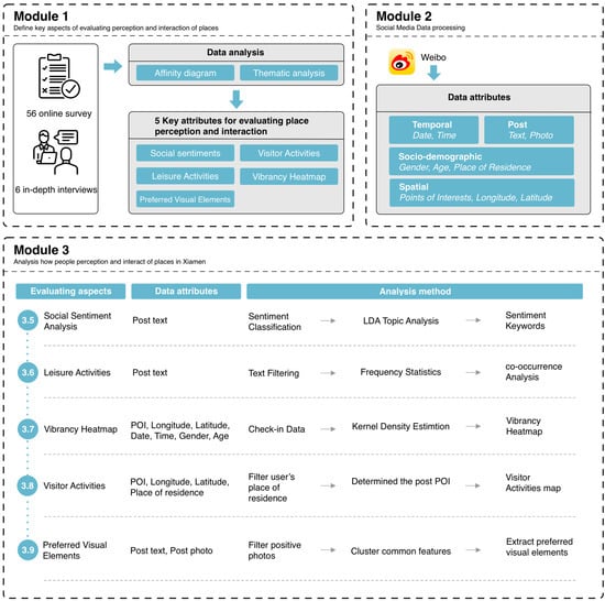 As illustrated in Figure 2, the novel approach for evaluating public space perception and interaction can be classified into three steps: Module 1: This module analyzes the key concerns of designers when evaluating the perception and interaction of public spaces through online surveys and interviews. Module 2: This module classifies the available data from the social media platform Weibo. Module 3: This module analyzes the public space perception and interaction in Xiamen based on the five aspects identified in Module 1 and the data obtained from Module 2.