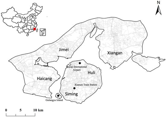 This case study focuses on the central area of Xiamen, China, located in the southeastern coastal region of Fujian Province in eastern China (24°23′ to 24°54′ N, 117°52′ to 118°26′ E). Figure 3 illustrates the study area. In Figure 3, the red dots indicate the location of the study area on the map of China. By 2020, the city had over 300 parks with a total area of nearly 8000 hectares. Xiamen’s location provides diverse public space forms, including waterfront parks and tropical botanical gardens, catering to diverse needs such as tourism, leisure, exercise, and social interactions. Thus, offering high-quality and attractive public spaces has always been a crucial focus for urban planners in Xiamen. Therefore, this study selects Xiamen as a case study to investigate and analyze the usage patterns of its public spaces. This study selected the central urban area of Xiamen, which encompasses over 60% of the city’s GDP and includes the most popular tourist attractions. It serves as the core region of urban life in Xiamen.