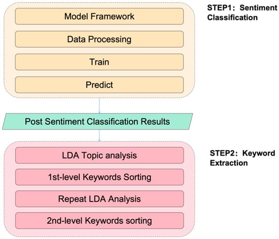 Beyond identifying posts with positive and negative emotions, it is crucial to investigate the origins of these emotions within the content. To achieve this, we conducted separate analyses on the positive and negative emotion corpora extracted from the posts. The framework utilized LDA modeling to extract keywords related to positive and negative emotions. LDA is one of the most commonly used methods to perform topic modeling tasks. It is a generative algorithm that can reveal the hidden relationships in a corpus set [55]. We can obtain keywords associated with positive and negative sentiments by employing the LDA model to analyze two datasets. Subsequently, we cleaned the lists to remove duplicate and irrelevant terms. We ranked the words based on their frequency of occurrence to identify the top five keywords that most strongly evoke positive and negative emotions. The posts related to the keywords were developed as well. Performing another round of LDA analysis on each sub-dataset allows for identifying sources for positive and negative sentiments, offering further design guidance. Figure 4 illustrates the comprehensive analysis process.