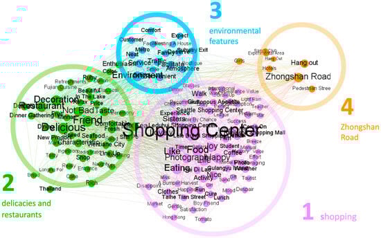Supporting leisure activities is vital to urban public spaces [30]. To analyze leisure activities, we utilized the open-source Chinese synonyms query toolkit called “Chinese Synonyms” [56] as our retrieval tool. Chinese Synonyms is a highly regarded synonym database for the Chinese language, containing over one hundred thousand entries and trained using extensive data and machine learning techniques. Using the term “leisure” and employing the vector-based semantic recall technique called Approximate Nearest Neighbor Search (ANN), we retrieved a set of phrases synonymous with leisure, such as “leisure travel”, “experiential”, “catering”, “vacations”, “shopping”, and others. We filtered the text data to establish relevant microblog entries related to leisure behaviors by referring to the retrieved synonymous phrases. The Chinese word segmentation and sentiment analysis software GooSeeker (V9.0) [57] was used to facilitate automatic word segmentation, frequency analysis, and co-occurrence matching functions. After the automatic word segmentation, we filtered out pronouns, adverbs, and other irrelevant terms. Then, we sorted and matched the keywords based on their frequency and co-occurrence, resulting in a co-occurrence matrix data table for leisure behavior data.