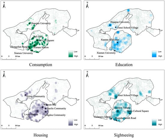 Geo-tagged social media data serve as an adept avenue for gauging city vibrancy. It represents micro-level spatial–temporal behavioral patterns and signifies instances where users engage in specific activities at distinct times and locations. We discern the spatial source bolstering urban vitality through the POI within check-in data. In this context, Kernel Density Estimation (KDE) was adopted to scrutinize check-in behaviors’ spatial and temporal distribution patterns [58]. Kernel density analysis calculates the density of point elements around each output raster image element. Within this study, KDE transformed discrete check-in points, accompanied by their respective check-in counts, into continuous surfaces representing their spatial density. The following equation determines the predicted density of the new (x,y) location:
