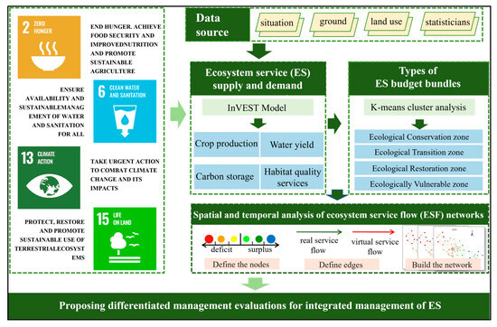 With increasing levels of urbanization and industrialization, the ecological environment faces more severe challenges. We have developed a research framework to address these challenges and enhance the regional ecological governance system and its capacity. This framework aims to support the sustainable development of Jilin Province (Figure 2). First, based on the United Nations Sustainable Development Goals (SDGs), and considering the development orientation of Jilin Province and existing ecological issues, we selected four ESs. We then employed relevant methods to quantify the supply, demand, and matching of ES supply and demand at the district/county scale for the years 2000, 2010, and 2020. Second, we posited that areas with a surplus of ESs could compensate neighboring areas with a deficit of ESs. On this basis, we constructed ESF networks using counties and ES bundles as units, respectively, to reveal the overall synergistic status of regional ES supply and demand. Finally, we integrated the basic characteristics of ES bundles and ESFs and proposed differentiated management measures by initially dividing functional zones. This approach provides detailed practical guidance for ecological governance from the perspective of regional integration.