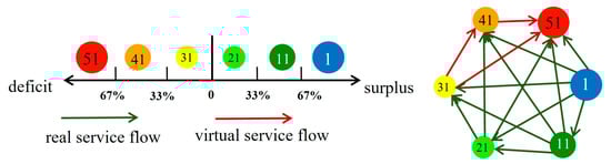 Step 2: Define edges. Edges are used to represent the connectivity of ESFs between two neighboring nodes. In this study, edges are set to exist in two forms: a real service flow, which is the flow from a node with a large surplus of the ecosystem service budget to a node with a deficit or a small surplus, and a virtual service flow, which is the flow from a node with a small deficit of the ES budget to a node with a large deficit because the source node itself is in the state of supply exceeding demand and is unable to provide additional ESFs outward. This kind of service flow is defined as virtual service flow.