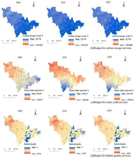 Table 4 indicates that for crop production services, the budget for food services exhibits a pattern of initially decreasing and then increasing, primarily influenced by supply factors. Overall, the supply of crop production services demonstrates a fluctuating upward trend, with a slight decline in 2010. This decline is closely linked to changes in arable land in Jilin Province. Meanwhile, shifts in dietary patterns and diversification have led to a general decline in the demand for crop production services [60,61]. Consequently, with a rising supply and decreasing demand, the budget for crop production services has generally trended upwards. The budget for carbon storage services exhibits a pattern of an initial decline followed by subsequent increases. During the first phase, both the supply and demand of carbon storage services rose, though supply growth was relatively modest. In the second phase, the demand for carbon storage services dropped significantly and the budget increased as a result. The budget for water yield services, on the other hand, shows a trend in increasing and then decreasing changes and is greatly affected by annual precipitation fluctuations, while the demand for water yield services has always shown a decreasing trend, which is related to the phenomenon of population loss in Jilin Province to a certain extent. The budget for habitat quality services has undergone a process of decreases followed by increases, with the decreases being smaller than the increases. The overall habitat quality has been somewhat enhanced and improved.