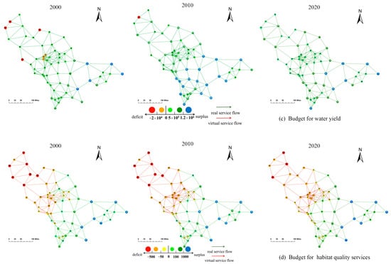Based on the definitions and assumptions outlined in Section 2.5.1, the service flow network was visualized using Gephi software (Figure 5). The network comprises 62 nodes, each representing the surplus or deficit status of ESs within districts/counties, and 185 edges that denote the status and direction of these service flows. Notably, crop production services displayed significant geographical variability, with the western region outperforming the eastern part of Jilin Province. Throughout the study period, the number of deficit nodes initially decreased, followed by an increase. However, by 2020, the budget for crop production services across Jilin Province had generally improved, and the number of surplus nodes with service budgets greater than 9 × 105 t increased from 10 to 15, all of which are concentrated in west-central Jilin Province. Regarding carbon sequestration services, Jilin Province maintained a relatively balanced state during the study period, with the most effective carbon sequestration observed in the southwestern part of the province. Notably, Tongyu County, in the northern region, identified as a key area in China’s “Three Norths” shelterbelt construction, exhibited one of the highest carbon sequestration service budgets in the province. In contrast, the urban area of Changchun City presented carbon deficit nodes, with Kuangcheng District experiencing changes in deficit status over the study period, and the imbalance of carbon storage services in this area further intensified. In addition, Jilin Province boasts extensive vegetation cover, leading to a sufficient supply of water yield services. Between 2000 and 2020, the number of deficit nodes consistently decreased, but the supply and demand of habitat quality services in Jilin Province are marked by pronounced regional disparities. Habitat quality services budgets are significantly better in the eastern region than in the western region, but in terms of nodes, the budget for habitat quality services in the western part of Jilin Province improved significantly by 2020, with the number of deficit nodes of less than −500 reduced from seven to three. Nonetheless, there are still consecutive habitat deficit nodes, resulting in an interrupted phase of habitat quality service flows in western Jilin Province, which is yet to be restored.