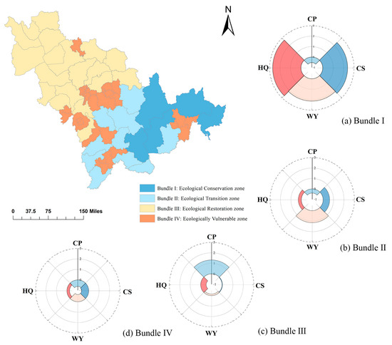 Bundle IV, comprising 28 districts/counties, covers 15.50% of the area and 42.37% of the population of Jilin Province. This bundle is located within the urban development centers of the province, boasting the highest population density (107,456 people/km2). It is the only cluster where all four types of ESs are in deficit, resulting in a high demand that significantly exceeds supply. This makes Bundle IV a deficit area for ESs in Jilin Province, necessitating support from adjacent regions’ ESFs.