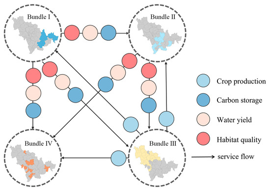 Additionally, we mapped the ESF network at the cluster scale (Figure 7). The spatial network relationships indicate significant potential for addressing the spatial mismatch between the supply and demand of ESs and for implementing differentiated ecological integration management in Jilin Province. Bundles I and II, which have surpluses in all three ESs except for crop production services, can provide various ESs to other clusters experiencing deficits. In contrast, Bundle IV serves as the “sink of ESs” in the province, experiencing shortages across all services and relying on inputs from other clusters to meet its ES needs. Bundle III is the only cluster with a surplus in food services, playing a crucial role in balancing crop production services across the province. The presence of surpluses or deficits in different ES budgets within these clusters indicates their roles as either providers or beneficiaries in inter-cluster relationships. For instance, Bundle III, as a beneficiary, receives carbon storage, water yield, and habitat quality services from Bundles I and II, while also supplying crop production services to meet the needs of Bundles I, II, and IV. In conclusion, the classification and visualization of ESFs can facilitate broader ES cooperation at the county scale and provide differentiated governance units for ecological integration and sustainable environmental management in Jilin Province.