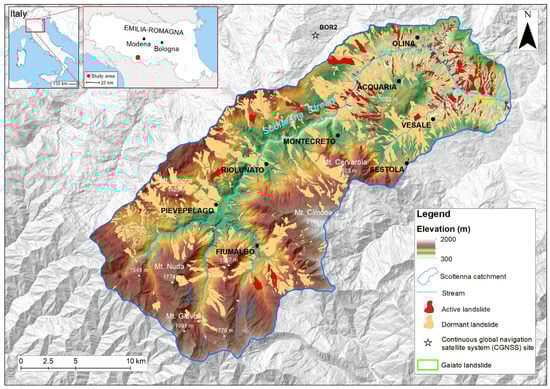 Location and physiographic aspects of the Scoltenna Stream catchment (Modena Apennines, Italy) and landslides of the IFFI inventory (available online: https://geoportale.regione.emilia-romagna.it/ accessed 10 May 2024).
