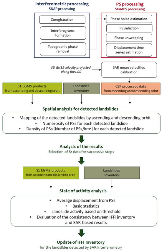 This research took advantage of a multidisciplinary approach for the detection, investigation and assessment of slope movements. Cartographic material and different datasets were analyzed: slope instability maps and landslide inventories and catalogs were complemented by satellite radar datasets, and detailed geomorphological surveys were carried out for ground truthing. The flowchart summarizing the proposed approach is presented in Figure 2.