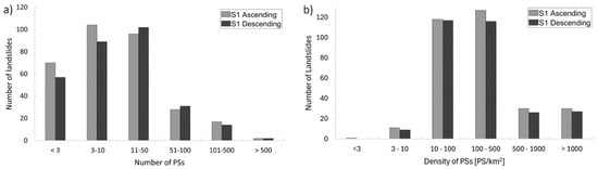Similarly, data from the descending orbit (Figure 3) overlap with 295 landslides, i.e., the 23.8% of the total mapped inside the catchment (1239), corresponding to the 58.0% of the catchment landslides area; the remaining 944 landslides (76.2%) are not represented. The 10.2% of the represented landslides (30 of the 295) are classified as active and the 89.8% (265) as dormant in the IFFI inventory. Moreover, 19.3% of the landslides include fewer than 3 PSs (57 of the 295), 30.3% contain 3 to 10 PSs (89 of the 265), 34.6% contain 11 to 50 PSs (102 of the 265), 10.5% contain 51 to 100 PSs (31 of the 265), 4.7% contain 101 to 500 PSs (14 of the 265), and only 0.6% are represented by more than 500 PSs (2 of 265) (Figure 4a). The distribution of the number of landslides with respect to the PSs density is presented in the graph of Figure 4b for both the S1 orbits, from which it can be noted that the majority of the detected landslides present a density of PSs in the ranges 10–100 PS/km2 and 100–500 PS/km2 for both the ascending and descending orbits.