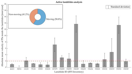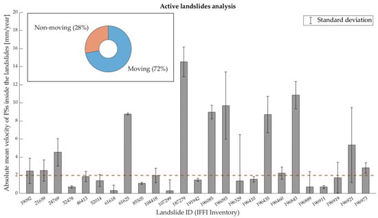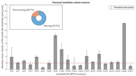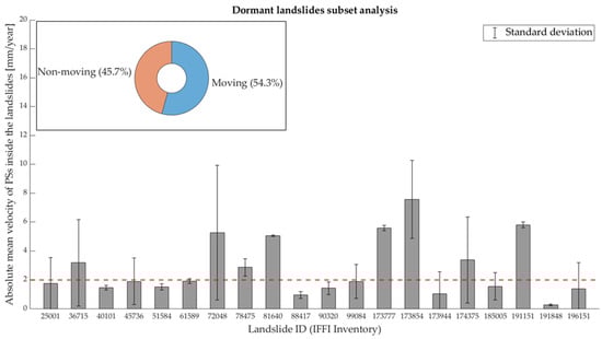 To verify the consistency between the classification of landslides as provided by the IFFI inventory and the displacements available from the processing of SAR data, an analysis based on the PSs mean velocity has been conducted. For each landslide with a minimum of 3 PSs, the basic statistical parameters and their numerosity have been computed and distinguished between active and dormant landslides. Moreover, given the higher number of landslides detected by the EGMS S1 data in comparison to those detected by the CSK data, the outlined analysis was performed exclusively on the S1 data. The results obtained are presented in Figure 7, Figure 8, Figure 9 and Figure 10 for both the ascending and descending orbit. In the figures, the term “moving” landslide indicates landslides for which the sum between the mean of the PSs mean velocities and its standard deviation is greater than a selected threshold of 2 mm/year [81], given an accuracy of 1–2 mm/year of the multi-temporal techniques. Similarly, “non-moving” refers to landslides where such a term is less than 2 mm/year. In the figures, the ID used corresponds to the code reported in the attribute table of the shapefile containing all of the landslides located in the Emilia Romagna Region. The shapefile is provided by the Geoportale of Emilia Romagna Region (https://geoportale.regione.emilia-romagna.it/, accessed on 17 July 2024 [60]). Figure 7 and Figure 8 represent the totality of the landslides detected during the ascending and descending satellite passes and classified by the IFFI inventory as active, while Figure 9 and Figure 10 present only a subset of the landslides detected by both orbits classified as dormant due to the large number of them. The analysis of the totality of the detected dormant landslides is reported in the Supplementary Materials. Considering the active landslides detected by the S1 ascending data (Figure 7), 72% are classified as moving and 28% as non-moving; for the S1 descending data (Figure 8), 58.8% are classified as moving and 41.2% as non-moving. When the analysis of the dormant landslides is considered, for the S1 ascending data (Figure 9), 79.3% are moving and 20.7% are non-moving; for the S1 descending data (Figure 10), 54.3% are moving and 45.7% are non-moving. Along with the representation of the mean velocity and standard deviation, a pie chart presenting the global consistency between the IFFI classification and the SAR-based results is reported. The consistency between the IFFI classification and SAR results is verified whenever the sum of the mean velocity of the landslide and its standard deviation is greater than the selected threshold whereas the opposite holds for dormant landslides.