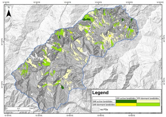 The results presented in Figure 7, Figure 8, Figure 9 and Figure 10 have been mapped to provide a geographical representation of the achieved performances and possible responses linked to the main terrain properties, dominant coverages and slope exposure. Figure 11 and Figure 12 show landslides classified according to the consistency between the IFFI inventory classification and the state of activity retrieved from the SAR ascending and descending data, respectively. The classification was performed according to five classes: landslides classified as active both by the IFFI inventory and the SAR state of activity, landslides classified as dormant both by the IFFI inventory and the SAR state of activity, landslides classified as active by the IFFI inventory and dormant by the SAR state of activity, landslides classified as dormant by the IFFI inventory and active by the SAR state of activity, and landslides non detected by SAR products (i.e., landslides for which fewer than 3 PSs have been detected).