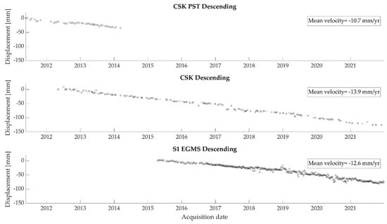 A deeper examination of the processes occurring at the Gaiato landslide was conducted by analyzing the time series of displacement of the selected PSs to monitor the evolution of the landslide over time. To this end, three independent datasets were considered: the S1 EGMS products, the CSK products processed by the authors (referring to the period 2012–2022) and the CSK products processed by the TRE Telerilevamento in the frame of the “Piano Straordinario di Telerilevamento” (PST), covering the period 2011–2014 (more information related to the PST can be found at [83]). In Figure 14, the time series of the three PSs nearest to the location identified by the white star of Figure 13 are presented. The point selected for subsequent time series analysis was identified as a key area of interest as it demonstrates the ability of the integrated method to study slow landslides and update the inventory. Indeed, the time series show that the area exhibits a well-defined deformative trend and significative displacement values, with a slight increase of the mean velocity from the year 2018.