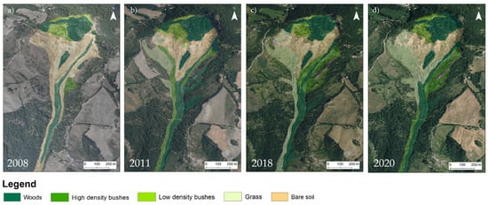 In 2008, about half of the surface of the Gaiato landslide was covered by bare soil (56%) and the remaining part was covered in woods (32%), high density bushes (3%) and low density bushes (9%) (Figure 15a). In 2011, the woods and bushes increased: woods reached 41% of the surface, high density bushes 14%, and low density bushes 8%. Moreover, 12% of surface was covered by grass, leaving only 25% covered by bare soil (Figure 15b). In 2018, the grass increased (reaching 24% of the surface) at the expense of woods and low density bushes: 35% of the surface was covered by woods and 5% by low density bushes; the high density bushes maintained the same extension (14%) and the bare soil occupied 22% (Figure 15c). In 2020, the woods extension remained more or less stable (34%), while 16% of the surface was covered by high density bushes, 7% by low density bushes, 23% by grass, and bare soil decreased to 20% of the surface (Figure 15d). It can be observed that the vegetated areas in the upper part correspond to the calcarenite formations where the crown of the landslide is situated. Conversely, the bare soil, which makes the more active areas of the landslides easily recognizable, is concentrated in clay terrains, characterized by sparser bushes.