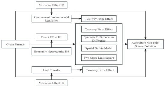 GF has the potential to curtail the advancement of ANPSP through land transfer, and its transmission mechanism can be delineated through the following three dimensions. Firstly, optimization of land resource allocation. GF, bolstered by financial backing, encourages agricultural stakeholders to embrace more efficient farming techniques. Consequently, this reduces the demand for land and other ecosystem resources, leading to diminished usage of ineffective inputs like chemical fertilizers and pesticides. This optimization effectively mitigates the negative externalities associated with agricultural production, fostering pollution control and emission reduction endeavors. Secondly, economic incentives for land transfer. GF incentivizes land transfer by providing economic inducements to agricultural producers who adopt sustainable agricultural practices. Through lowered financing costs and more lenient loan conditions, it facilitates financial support for agricultural producers, thereby facilitating the transition towards environmentally friendly agricultural production [52,53]. Thirdly, investment in agri-environmental technologies. GF support encompasses investment in environmentally friendly agricultural technologies. This implies that agricultural producers can secure funds to procure environmentally friendly agricultural tools such as conservation irrigation systems and eco-fertilizers. The application of these technologies aids in alleviating ecological pressures on land. Therefore, based on these observations, this paper posits the following hypothesis: