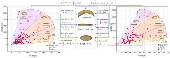 Figure 2 shows that before the failure of the Sedongpu natural dam, the boulder bars in the study area were within an interval of λ ∈ [1.04, 43.74]. Moreover, 95% of the boulder bars were less than 1000 m in length and less than 100 m in width. From a data distribution perspective, the lengths and widths of the boulder bars are linearly positively correlated.