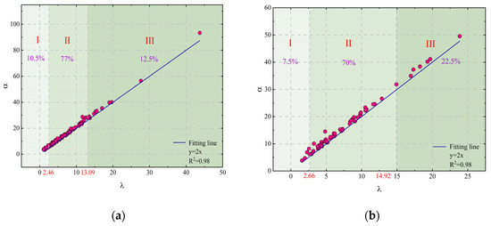 The relationship between λ and α. (a) Before the natural dam failure and (b) after the natural dam failure. The red dots in the figure represent the field data about the 171 collected boulder bars in study area. The red fonts along X-axis are the boundary values for different intervals. The Ⅰ, Ⅱ, and Ⅲ are the intervals as shown in Figure 2 and the numbers 10.5%, 77%, 12.5%, 7.5%,70%, and 22.5% are the proportions for the corresponding intervals.