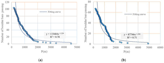 The relationship between the number of boulder bars with a perimeter greater than P and P (a) before the failure of the Sedongpu natural dam and (b) after the failure of the Sedongpu natural dam. The dots in the figure represent the field data about the 171 collected boulder bars in study area.