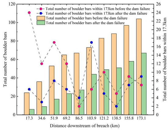 - After the dam failure, the number of boulder bars decreased with increasing distance from the dam, and the number of boulder bars every 17.3 km first increased and then decreased with increasing distance from the dam.