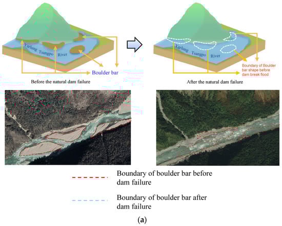 Floods that are caused by natural dam failures are a common type of flooding in river basins. Many cases have shown that outburst floods triggered by natural dam bursts can change the sizes and shapes of boulder bars downstream [10,11]. For example, Wu et al. [11] selected a research area located 17 km downstream of Yigong Barrier Lake and found that outburst floods were responsible for a reduction in the area of boulder bars in the study area. However, these studies analyzed only the areas, lengths and widths of boulder bars, and the quantitative relationships among these different parameters were not examined. In particular, there is a lack of comparative analyses of the sizes of boulder bars before and after natural dam failures. In addition, the variation modes of boulder bars after a natural failure are also an interesting topic, but they have not been reported in the literature.