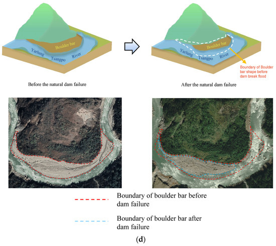 The boulder bar evolution modes that are triggered by outburst floods. (a) Mode 1: the original boulder bars disappear when triggered by outburst floods. (b) Mode 2: the boulder bars are displaced by the outburst flood. (c) Mode 3: the boulder bars are synthesized from multiple boulder bars into one by the outburst flood. (d) Mode 4: the boulder bar sizes decrease due to outburst floods. The images are Landsat 8 remote sensing images from Google Earth (https://earth.google.com/web/ (accessed on 20 January 2024)).