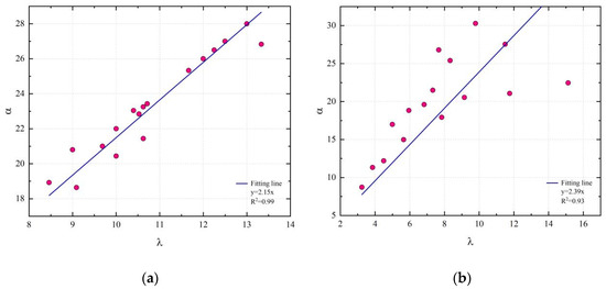 The relationship between λ and α. (a) Experimental flume data of Jiang et al. [10]. The red dots in the figure stand for the experimental data (b) Field observation data of Wu et al. [11]. The red dots in the figure stand for the field data.