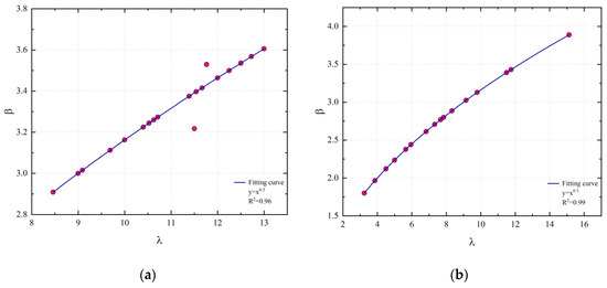 The relationship between β and λ. (a) Experimental flume data of Jiang et al. [10]. The red dots in the figure stand for the experimental data (b) Field observation data of Wu et al. [11]. The red dots in the figure stand for the field data.