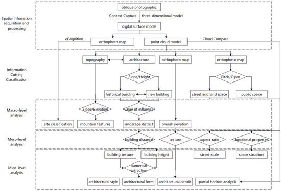 Firstly, through the drone tilt-photography modeling, using the Context Capture Center-23.0.0.1317, the photo data were intelligently processed to generate a point cloud model with spatial location information, i.e., a three-dimensional real-life digital surface model (Figure 2). According to the expansion characteristics of data processing and analysis, cloud compare point cloud analysis software was used to transform the model data into pseudo-color elevation maps and adjust the height thresholds corresponding to the colors, so that the base and objects on the ground could be separated, extracted, and screened, and the three-dimensional models of multiple subsystems, such as buildings, vegetation, roads, and the ground, could be obtained (Figure 3). Among them, the ground layer is called the digital elevation model, which can more accurately analyze the relationship between the settlement configuration and the landform. At the same time, eCognition-v9.5.1 intelligent image analysis software was used to train artificial intelligence on the orthophotos to obtain the land-use classification of the village. Then, the point cloud processing technology was used to count the distance, slope, morphology, and other data of the point cloud in each layer. The geomorphological zoning, mountain features, and overall façade at the macro were analyzed, as were the historical features such as the architectural texture, building height, and exterior space at the meso level. Finally, the features and local views of the individual buildings at the micro level were also analyzed (Figure 4).