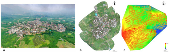(a) Panoramic view of Puping Village. Source: Screenshot of aerial panorama of Puping Village; (b) The orthophotograph of Puping Village. Source: Digital Orthophoto Map (DOM) based on oblique photography; (c) Digital elevation model. Source: Digital Surface Model (DSM) based on oblique photography.