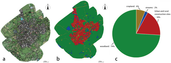 (a) Image segmentation chart; (b) Site classification extraction map; (c) Percentage of site classification chart. Source: Drawn by author based on eCognition intelligent image analysis software, the DSM map of Puping Village is intelligently segmented, and village elements such as green areas, buildings, water surfaces, roads, etc. are extracted based on the image filtering information and combined with artificial model training.