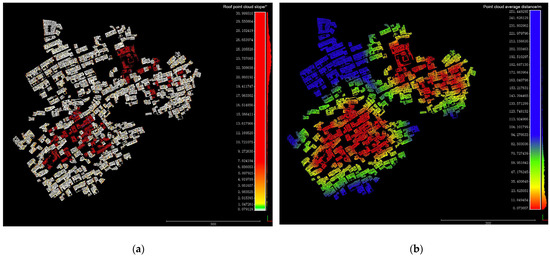 (a) Distribution of traditional buildings chart, Source: Point cloud map drawn by the author based on cloud compare after filtering the point cloud of buildings for slope. Traditional buildings with sloped roofs in red, modern buildings with flat roofs in white; (b) Scope of influence of traditional architecture. Source: Radiation range map drawn by the author based on the distance between the point cloud of traditional buildings and the point cloud of modern buildings, with the deeper influence of traditional buildings in red and the weaker influence in blue.