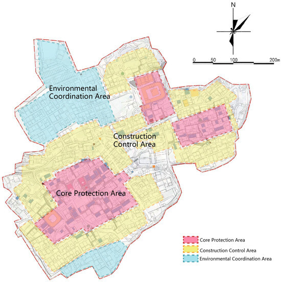 The Conservation Area Zoning Map in Puping Village. Source: Drawn by the author referring to Figure 7b Sphere of Influence Map; the topographic map of the village is combined with the topographic map of the village to differentiate and delineate the protection scope of the village along the building boundaries.