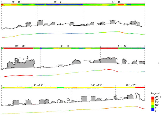As a typical mountainous settlement, the slope of Puping Village directly affects the pattern of its building clusters. To analyze the spatial pattern of mountainous settlements, two layers of topography and architecture were compared to study the cross-section slopes of different plots. Then, the distance of cross-section point cloud data was analyzed to calculate the slope value. In this paper, three cross-sections of settlements were selected (Figure 9). Combined with the information on the age of the buildings, it can be seen that the historical buildings are mostly distributed on the gentle slope and flat slope topography of 0°~10°, while the modern buildings are more often distributed on the slightly steeper slopes or reclaimed land topography of 10°~20°. The original village is a terrace spatial pattern. However, because of the population growth after the saturation of the village, the construction of village houses had to choose the areas with larger slopes. It not only destroyed the original terrace pattern but also caused problems such as high building density and limited open space.