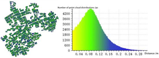 The architectural texture of traditional villages can be analyzed by building spacing and building form. Although this method cannot cover the characteristics of the architectural texture, it can determine the compactness of their villages more accurately. By calculating the proximity distance value from the point cloud data of the building layers (Figure 10), it is found that the building spacing in Puping Village is concentrated at 0.5~1.4 m; the building spacing in the core area is generally below 0.6 m; and the spacing of the newly built part of the buildings is at 1~2 m. It can be seen that the relatively high density and the compact layout are some of the important characteristics of the architectural texture of Puping Village.
