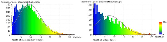 Street and lane space is an important component of traditional village historical features. The height-to-width ratio of buildings on both sides of the street is a crucial indicator for assessing the spatial structure [104]. In the application, the separated building layers are used to filter vertical point clouds, and the street and alley layers are separated to obtain the point clouds along the village street elevation. Finally, the width of each street can be statistically calculated by batch calculating the point cloud distance between the two sides of the street. As shown in Figure 12, the width of the main street is basically in the range of 10 m, while traditional streets range from 1 to 6 m. Similarly, by extracting the point clouds of the streets and alleys from the oblique photography model, the aspect ratio of the streets and alleys can be counted. There is a significant difference between the height-to-width ratio of the alleys in the core area of Puping Village and the newly built area. The traditional alleys in the core area have a height and width ratio of 0.3~1, while the alleys in the newly built area have a height and width ratio of more than 1, and partially even higher than 2, which creates a certain sense of oppression and is mainly due to the high height of the newly built buildings.
