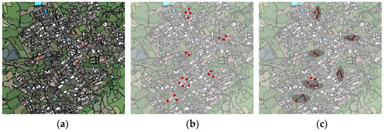 (a) The image segmentation diagram; (b) The public space distribution map and the red dots are the public space; (c) Public space analysis and the grey area is a core of nuclear density consisting of several public space nodes. Source: Drawn by the author based on nearest-value domain connection of core points of empty public space extracted by image segmentation.