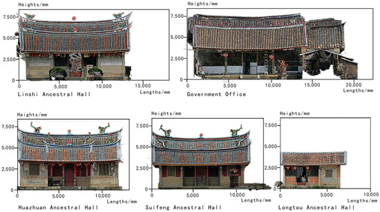 In micro-level architectural features analysis, point cloud models of specific buildings can be isolated and the color, scale, height, and spacing of a particular type of building can be counted to analyze its architectural type, exterior form, and scale using the methodology described in the previous section. There are many ancestral hall buildings among the surviving traditional buildings in Puping Village, which are the most central and architecturally outstanding buildings in many Chinese villages (Figure 14). They embody both family and place-based identities [105]. These ancestral hall buildings are mostly typical of the traditional large houses in southern Fujian, with three-room and five-room houses, mostly in the form of San Chuan ridges, and with façades mostly in a 2:1 ratio relationship. At the same time, the façade data were analyzed by the image analysis software eCognition, which allows the extraction of a database of architectural style elements such as roofs, walls, doors, and windows. For detailed analyses of architectural features, digital technology was not able to replace traditional building mapping, but through the point cloud extraction of characteristic buildings, the features and scale relationships of the buildings could be preliminarily judged, providing a basis for subsequent detailed analyses.